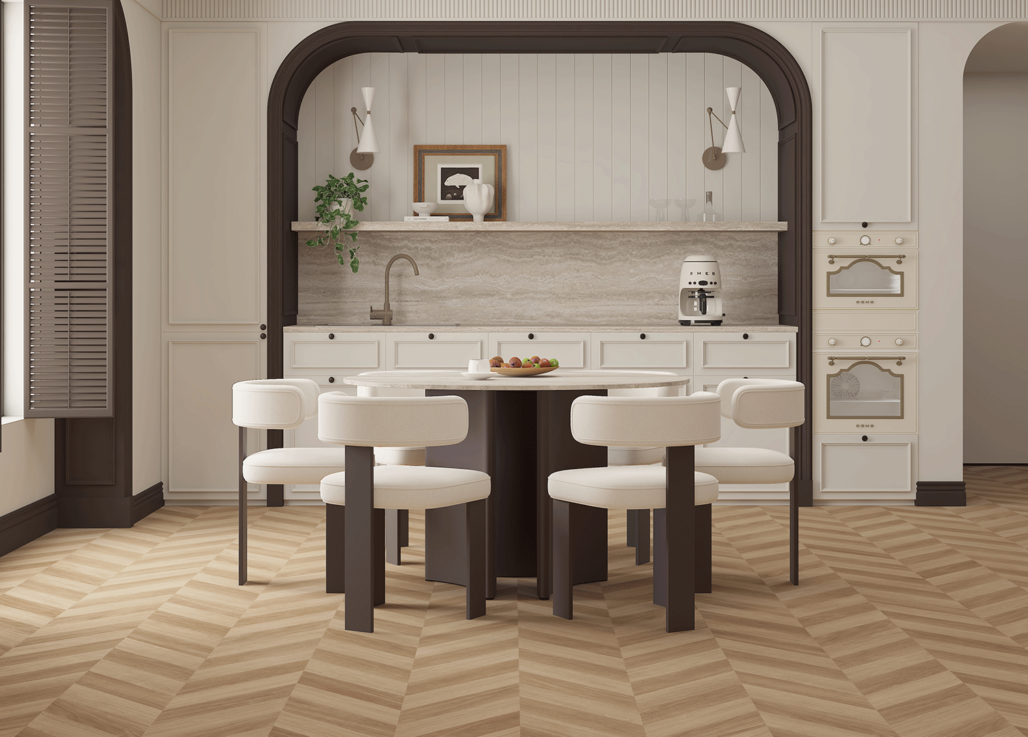 Derived from Italian Travertino, the light and elegant base color interprets a sense of natural beauty, gentle and versatile textures embody an elegant style.