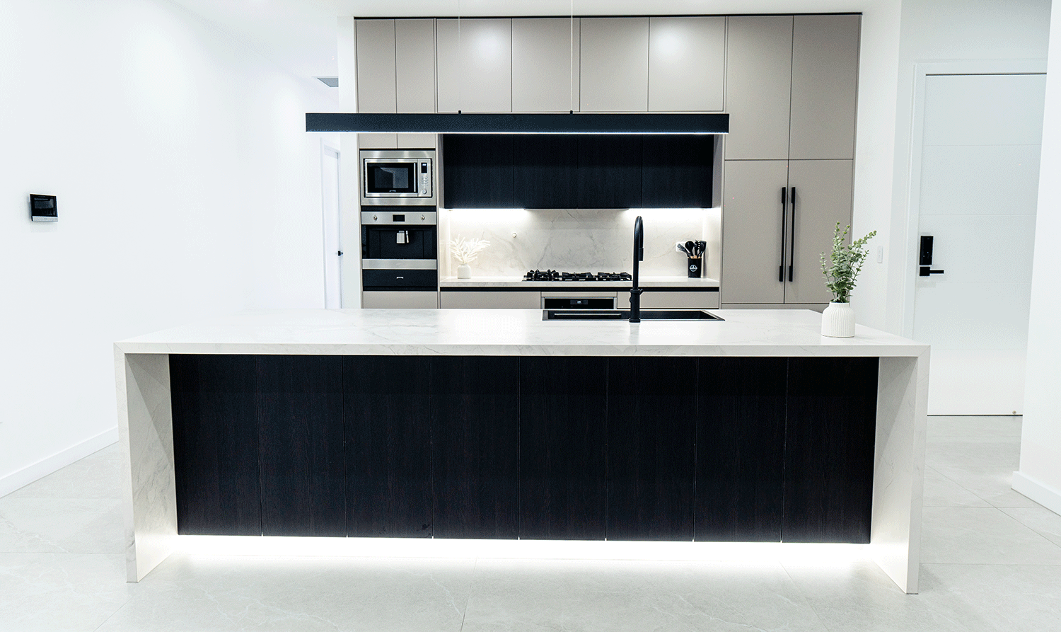 A language of light in architcctural form. With its high-gloss mirror finish, the lextures scem to float, expanding the space and sharpening its contours.