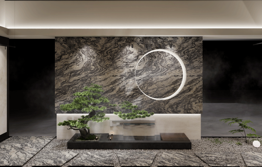 As the water gently flows, the grandeur of natural stone intertwines with the fluidity of water, capturing the essence of the Eastern philosophy of “dwelling in serenity, free from the clamor of carriages and horses.”