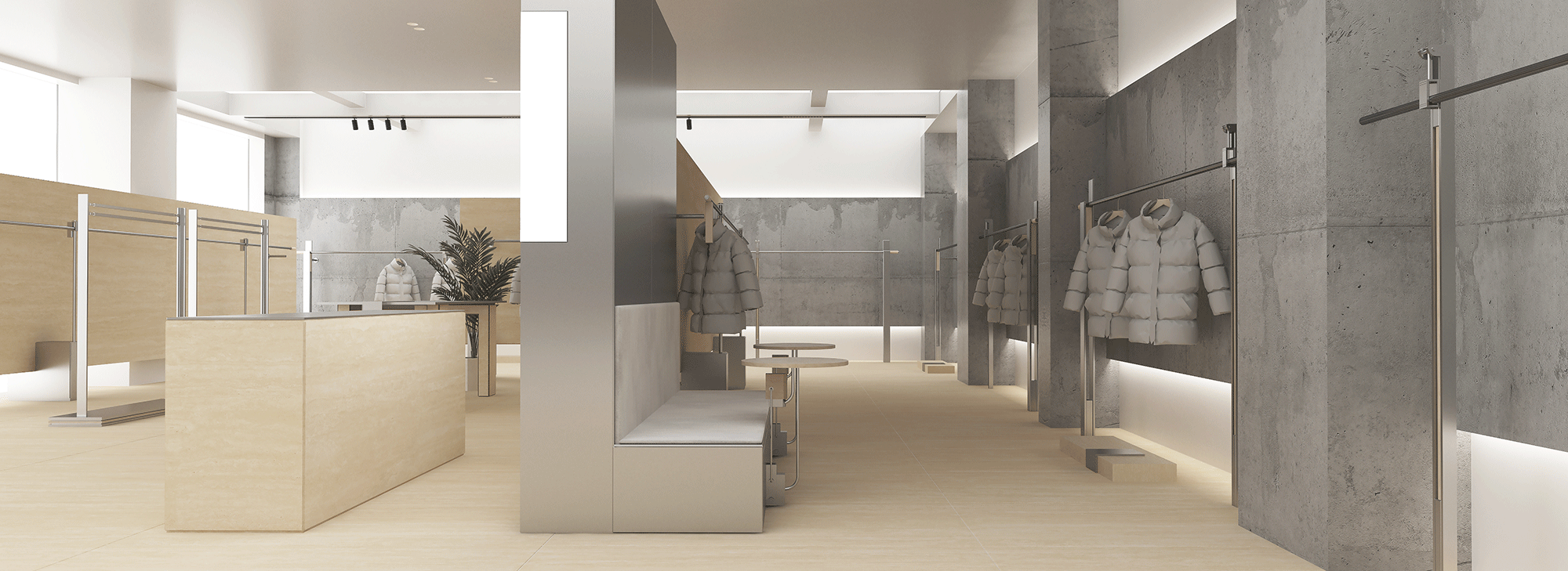 A language of light in architcctural form. With its high-gloss mirror finish, the lextures scem to float, expanding the space and sharpening its contours.