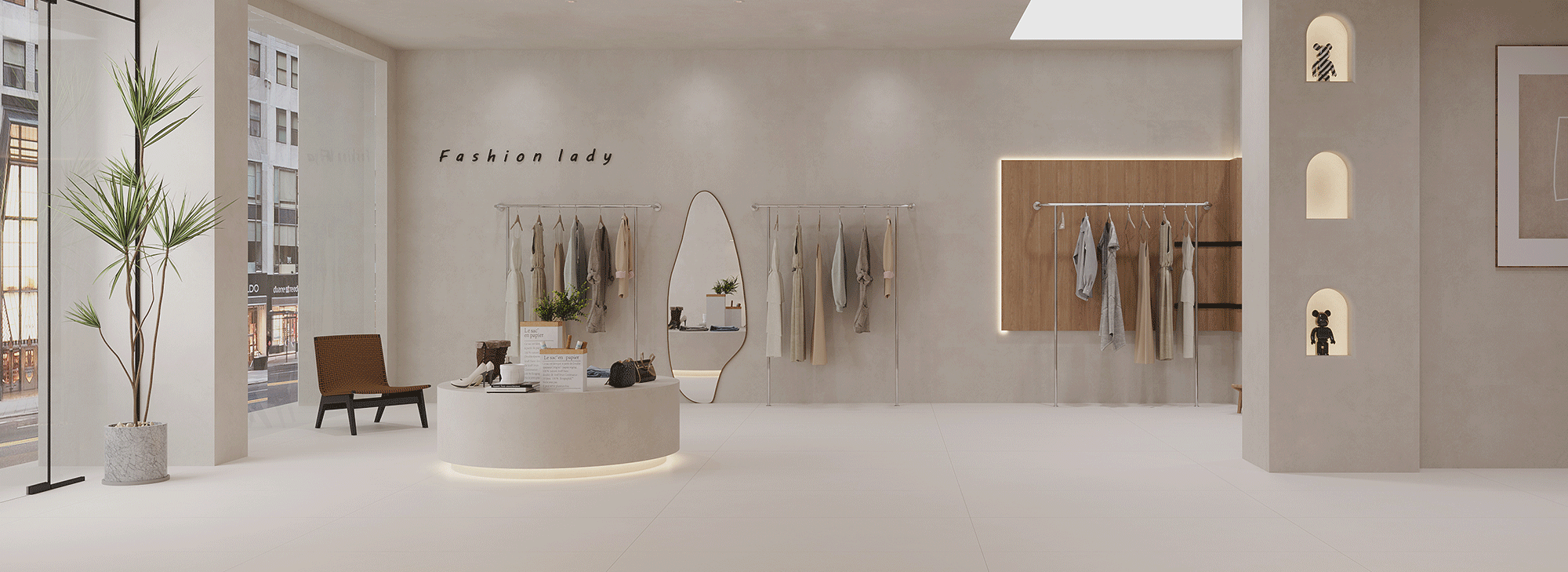 A language of light in architcctural form. With its high-gloss mirror finish, the lextures scem to float, expanding the space and sharpening its contours.
