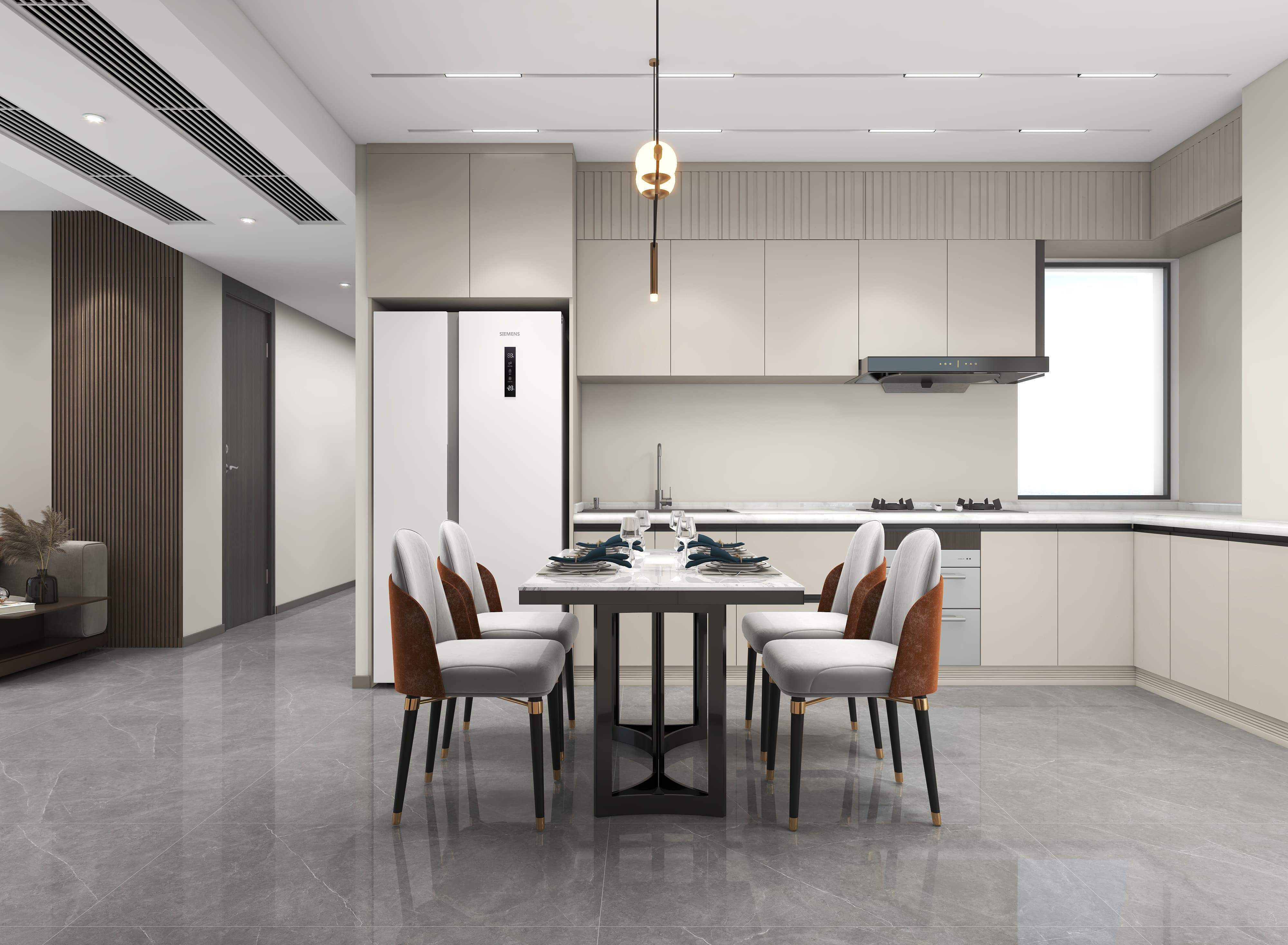 A language of light in architcctural form. With its high-gloss mirror finish, the lextures scem to float, expanding the space and sharpening its contours.