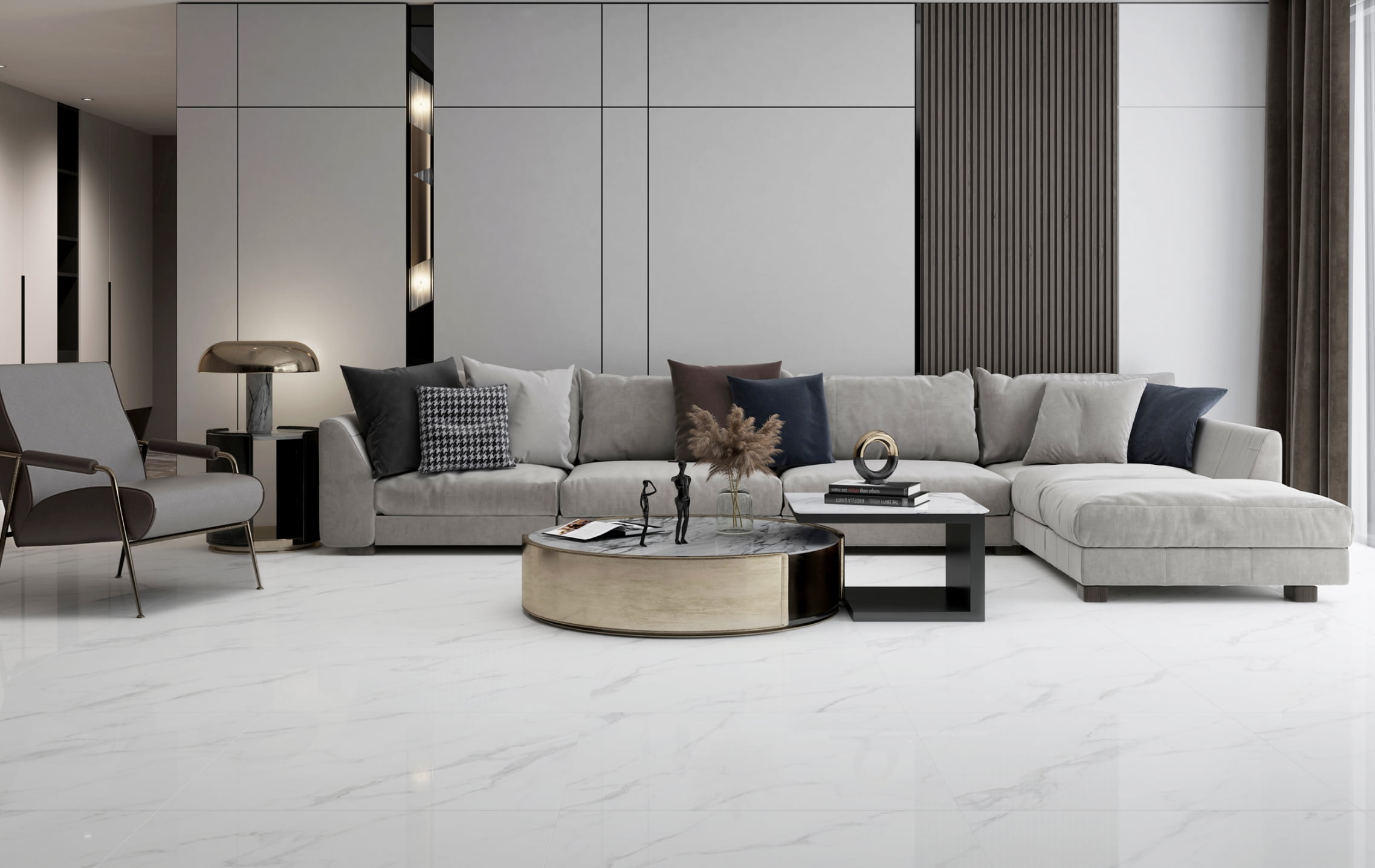 A language of light in architcctural form. With its high-gloss mirror finish, the lextures scem to float, expanding the space and sharpening its contours.