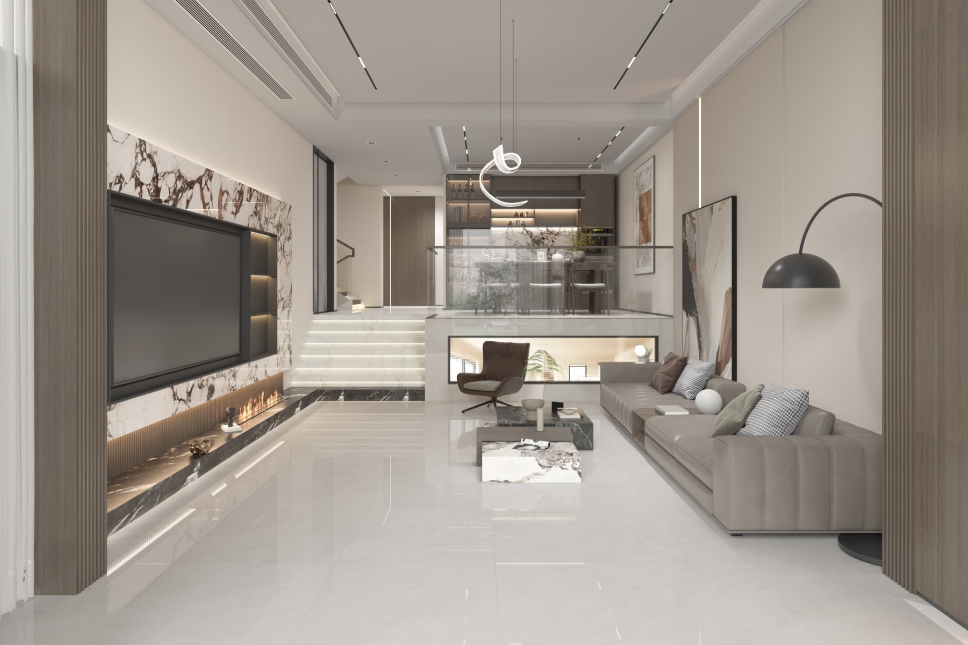 A language of light in architcctural form. With its high-gloss mirror finish, the lextures scem to float, expanding the space and sharpening its contours.