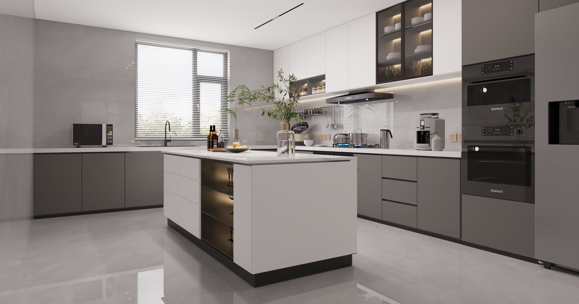 A language of light in architcctural form. With its high-gloss mirror finish, the lextures scem to float, expanding the space and sharpening its contours.
