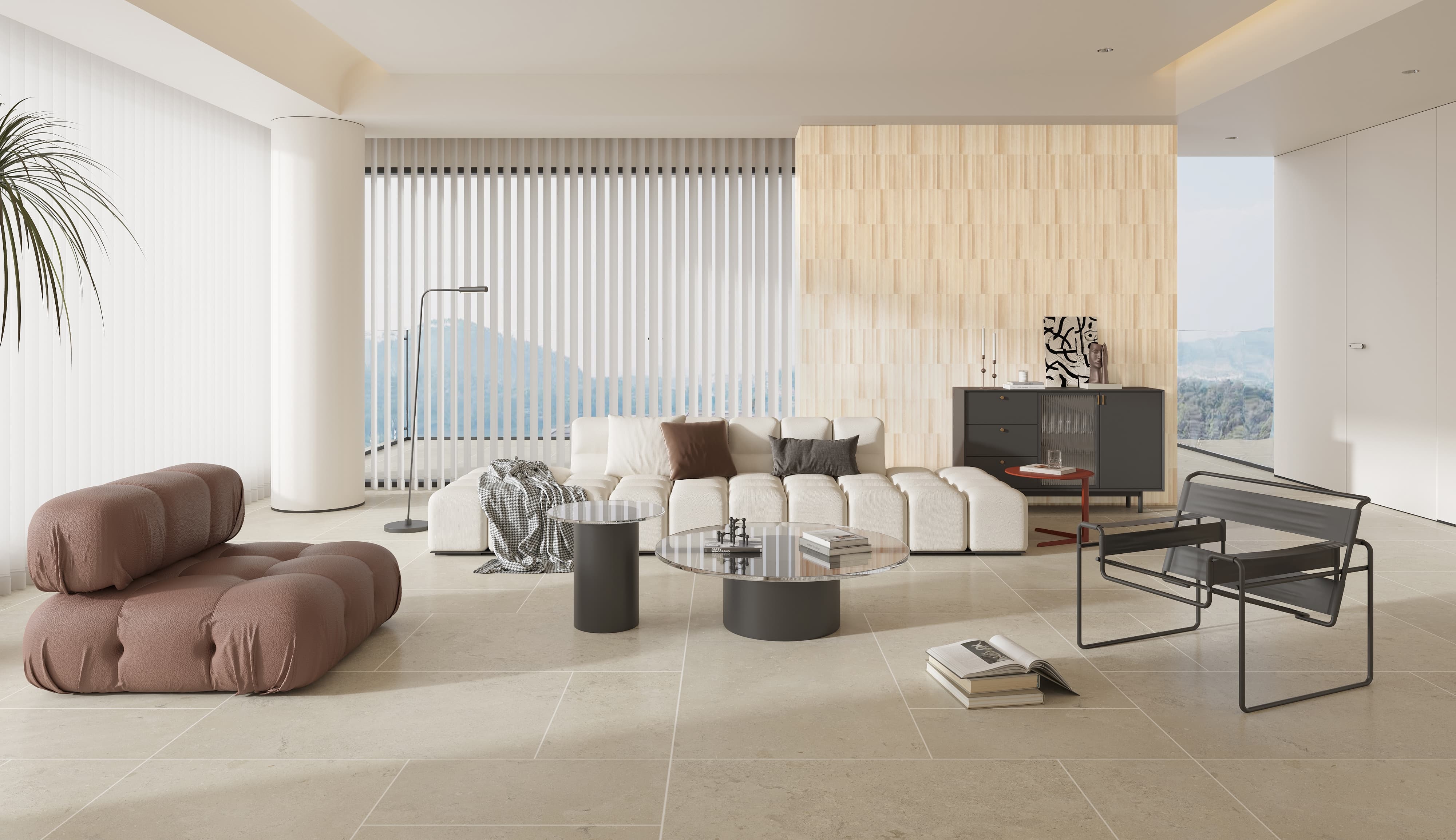 A refined balance between natural limestone texture and contemporary sensibility.