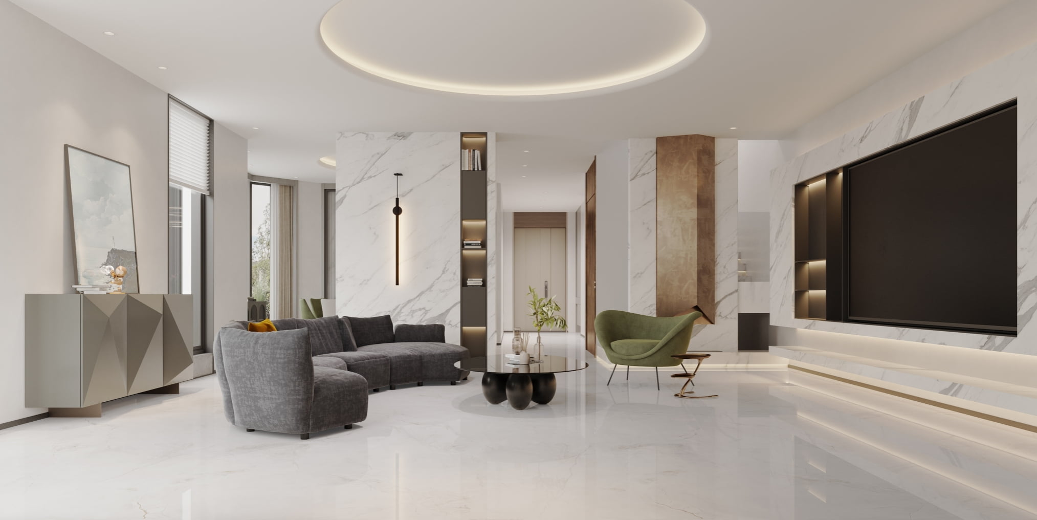A language of light in architcctural form. With its high-gloss mirror finish, the lextures scem to float, expanding the space and sharpening its contours.