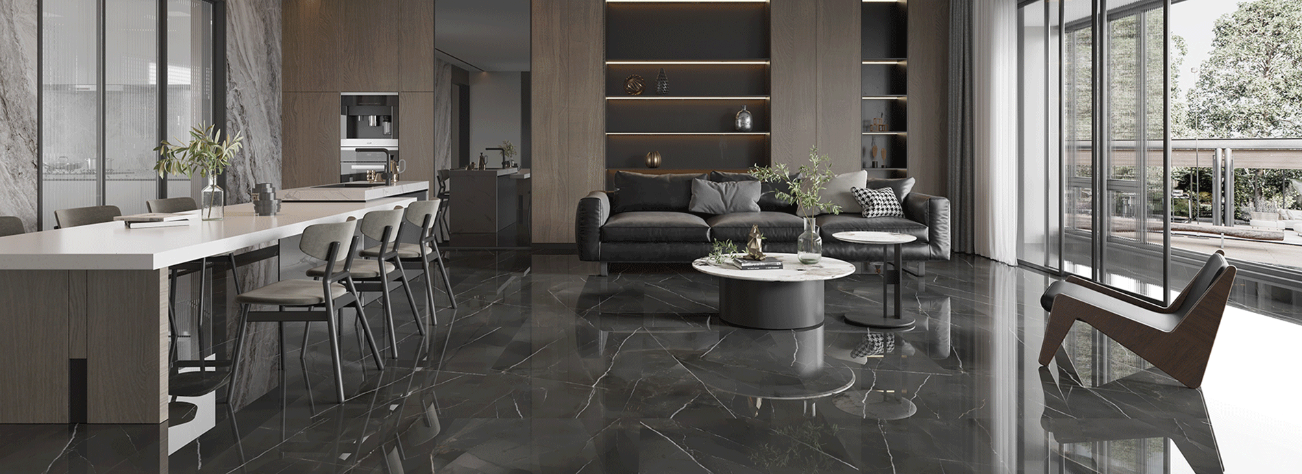 A language of light in architcctural form. With its high-gloss mirror finish, the lextures scem to float, expanding the space and sharpening its contours.