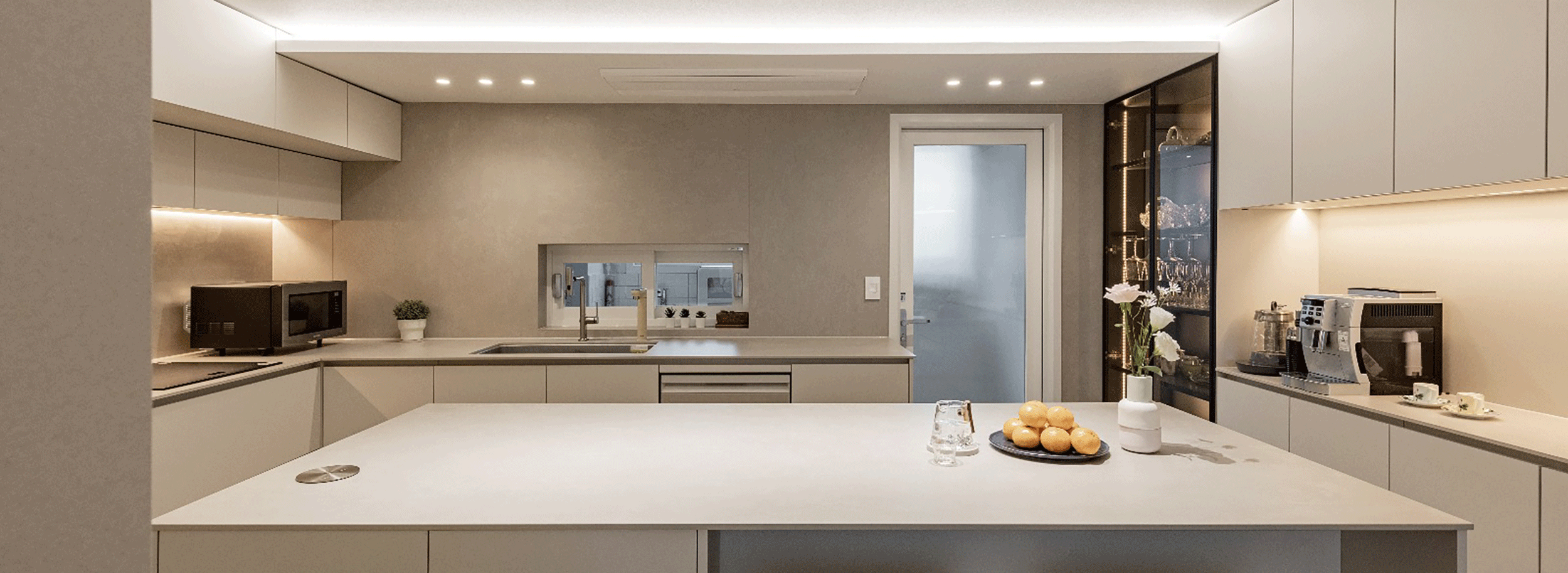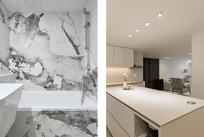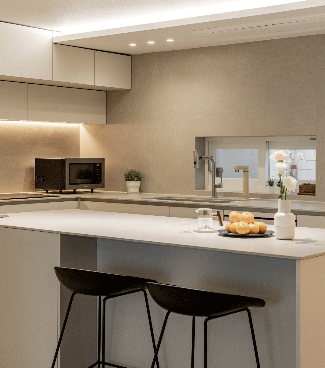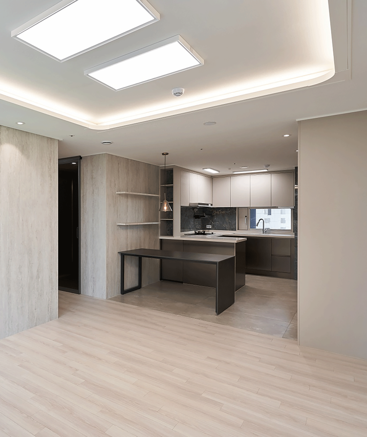 The project employs a simple and bright color palette, fostering an open and airy living environment. This harmonious color scheme enhances the overall quality and aesthetic of the space.By carefully selecting our tiles and slabs, the interiors not only gain visual appeal but also an elevated sense of texture and comfort, creating an inviting and livable atmosphere.